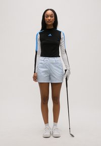 Donna che indossa una maglia sportiva nera a maniche lunghe con pannelli blu e bianchi e pantaloncini azzurri, in piedi davanti a uno sfondo neutro.