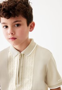 Ragazzo giovane con capelli ricci scuri che indossa una polo beige a maniche corte con pannello frontale decorato e dettaglio con cerniera.