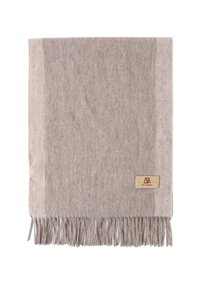 Sciarpa di lana rossa con bordi frangiati, appoggiata su un cappotto beige. Presenta un piccolo tag con il marchio sulla sciarpa. Tessuto morbido, forma rettangolare.