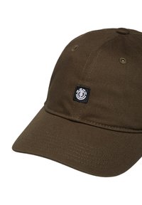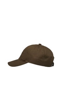 Cappellino da baseball verde oliva scuro con pannelli cuciti e una piccola toppa con logo nero al centro davanti.