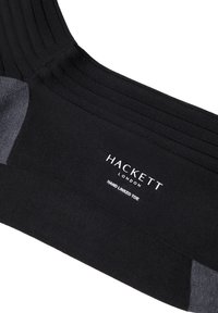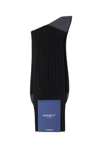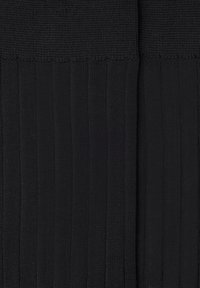 Calze nere a coste fino a metà polpaccio con punte e talloni rinforzati di colore grigio scuro, posate distese e leggermente sovrapposte su uno sfondo bianco.