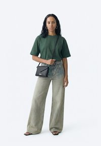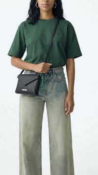 Donna con capelli neri indossa una maglietta verde, jeans slavati a gamba larga, borsa a tracolla nera e sandali neri, in piedi davanti a uno sfondo semplice.