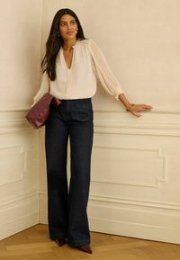 Donna con lunghi capelli scuri che indossa una camicetta color crema con maniche a sbuffo, jeans larghi e scuri e scarpe bordeaux con punta appuntita.
