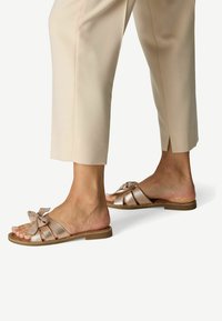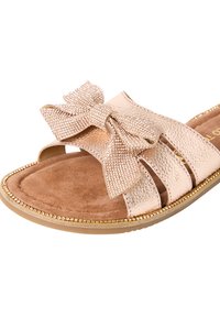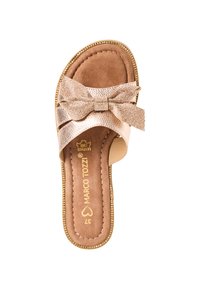 Sandali piatti scivolati color oro rosa con finitura testurizzata, caratterizzati da un grande fiocco decorativo sulla punta e un design semplice a punta aperta.