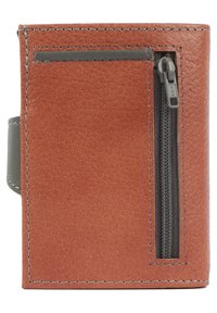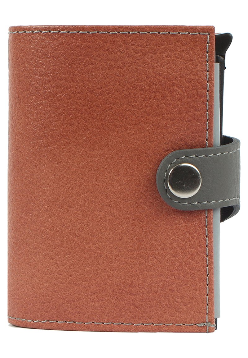Portafoglio compatto in materiale marrone texturizzato, con cinturino a bottone grigio, hardware in argento e dettagli di cucitura visibili.