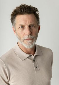 Uomo di mezza età con barba grigia, indossa una polo beige e jeans blu, guarda verso il basso mentre stringe le mani davanti a uno sfondo semplice.