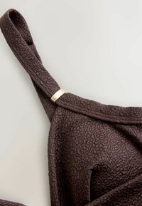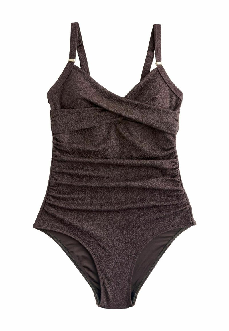 Costume intero marrone scuro con trama, dotato di spalline regolabili e corpetto incrociato arricciato.