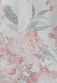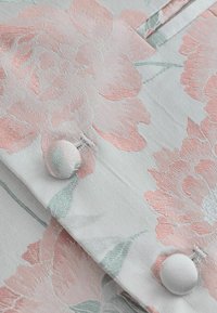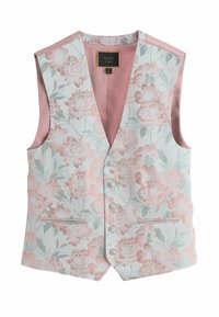 Gilet floreale bianco, con motivi di fiori rosa pastello e verdi, retro rosa uniforme, cinque bottoni e due tasche anteriori.