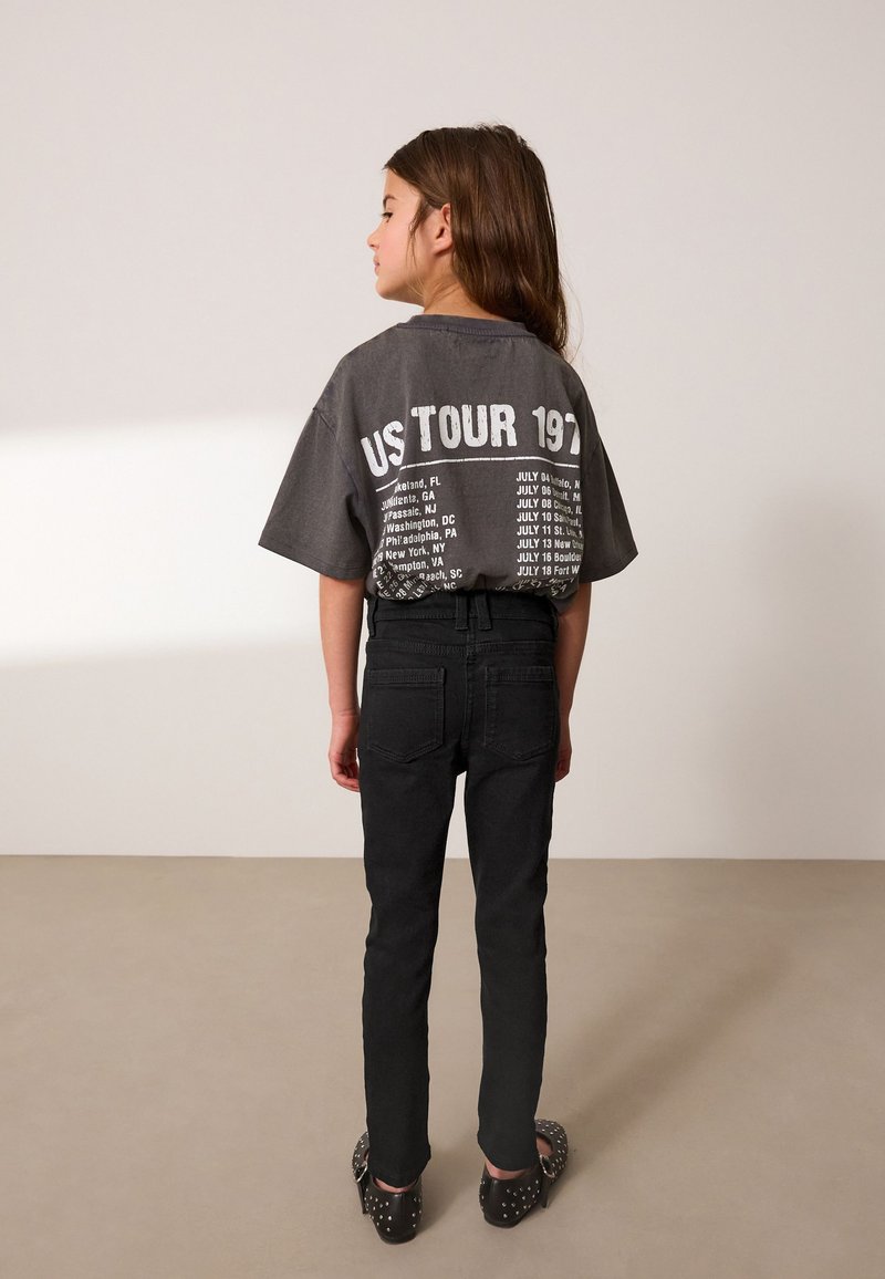 Ragazza con lunghi capelli castani in piedi di profilo, indossa una maglietta grigia scura larga "US Tour 1977", jeans neri e scarpe nere borchiate.