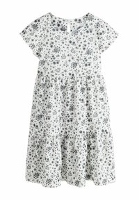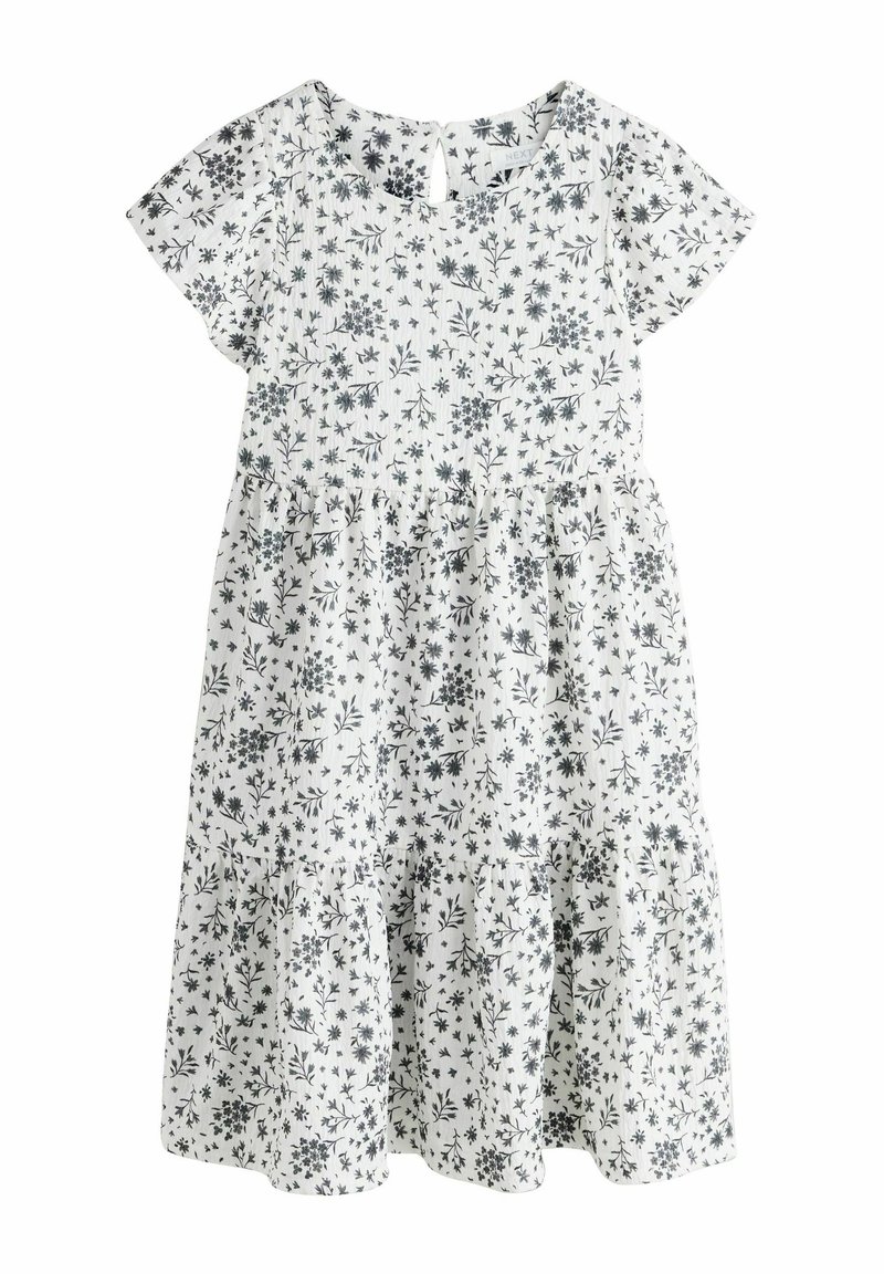 Abito floreale bianco con collo rotondo, maniche corte e gonna a balze arricciate; presenta motivi floreali grigi su tessuto strutturato.