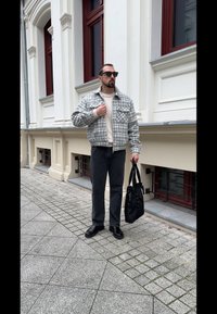 • Giacca a quadri grigia cropped sopra un maglione beige, pantaloni grigio scuro e scarpe nere. Tiene una borsa tote nera, in piedi contro un muro texturizzato.