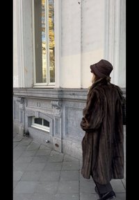 • Donna con capelli ricci che indossa un cappotto di pelliccia marrone, un cappello a secchiello, un cardigan beige e pantaloni scuri, in piedi su un marciapiede cittadino vicino a un edificio in pietra.