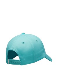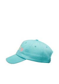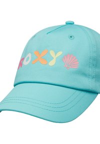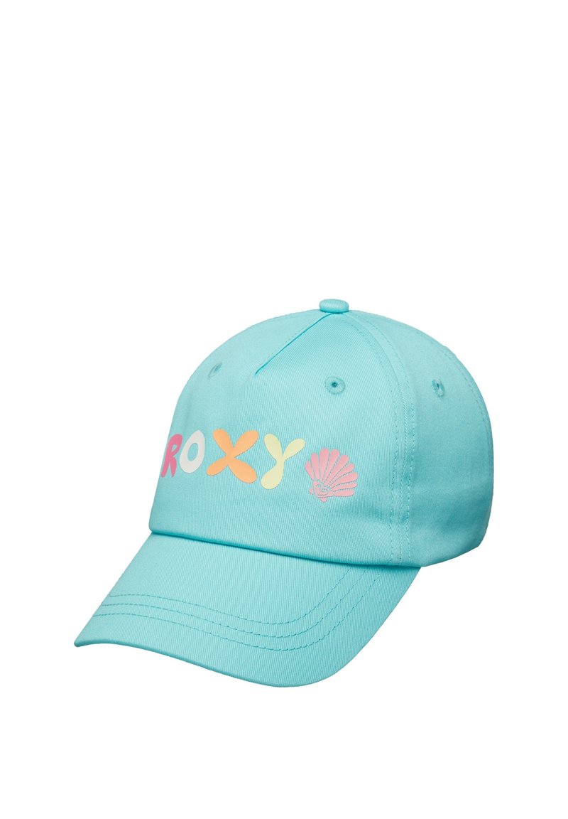 Cappellino da baseball azzurro chiaro con scritta colorata "ROXY" e piccolo motivo a conchiglia sul davanti, con fori di ventilazione cuciti e visiera curva.