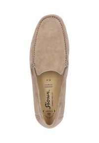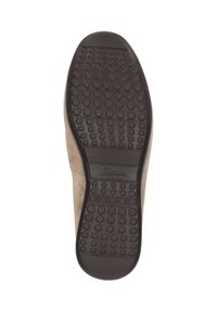 Mocassino beige in camoscio senza lacci con punta arrotondata, dettagli cuciti, suola bassa in gomma nera e fodera interna a righe.