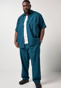 Un uomo in piedi con le mani in tasca indossa pantaloni di lino turchese, camicia a maniche corte coordinata, maglietta bianca sotto, scarpe nere e orologio da polso argentato.