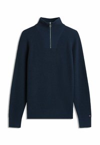 Maglione in maglia marrone con colletto alto e chiusura a mezza zip. Presenta un motivo testurizzato e un sottile logo sul manica.