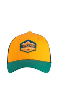 Cappellino da baseball arancione e verde con una toppa con la scritta "Trollkids Expedition" con grafica di montagne e una piccola bandiera.