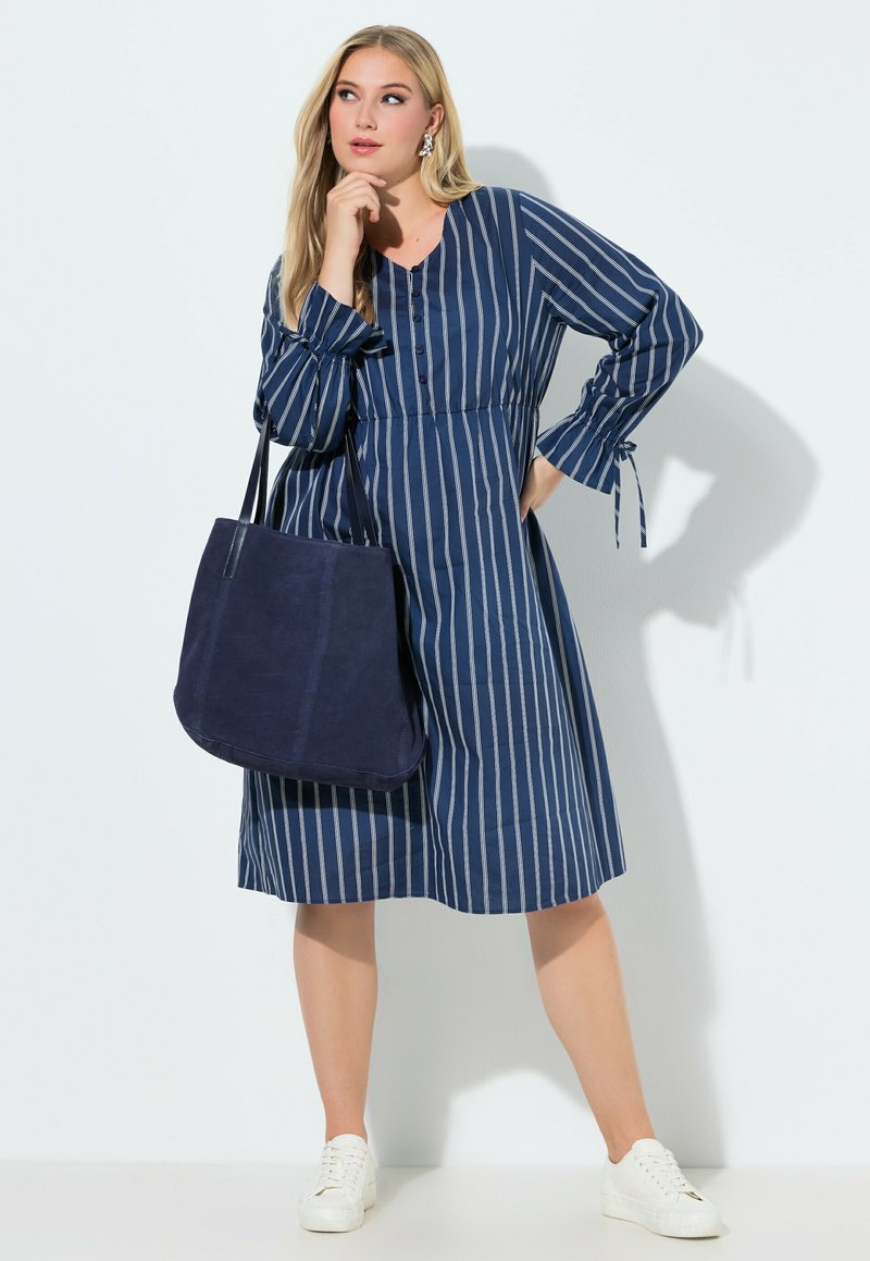 Abito a righe navy con scollo a V, chiusura frontale con bottoni e maniche lunghe. Abbinato a una borsa tote scura e scarpe da ginnastica bianche.