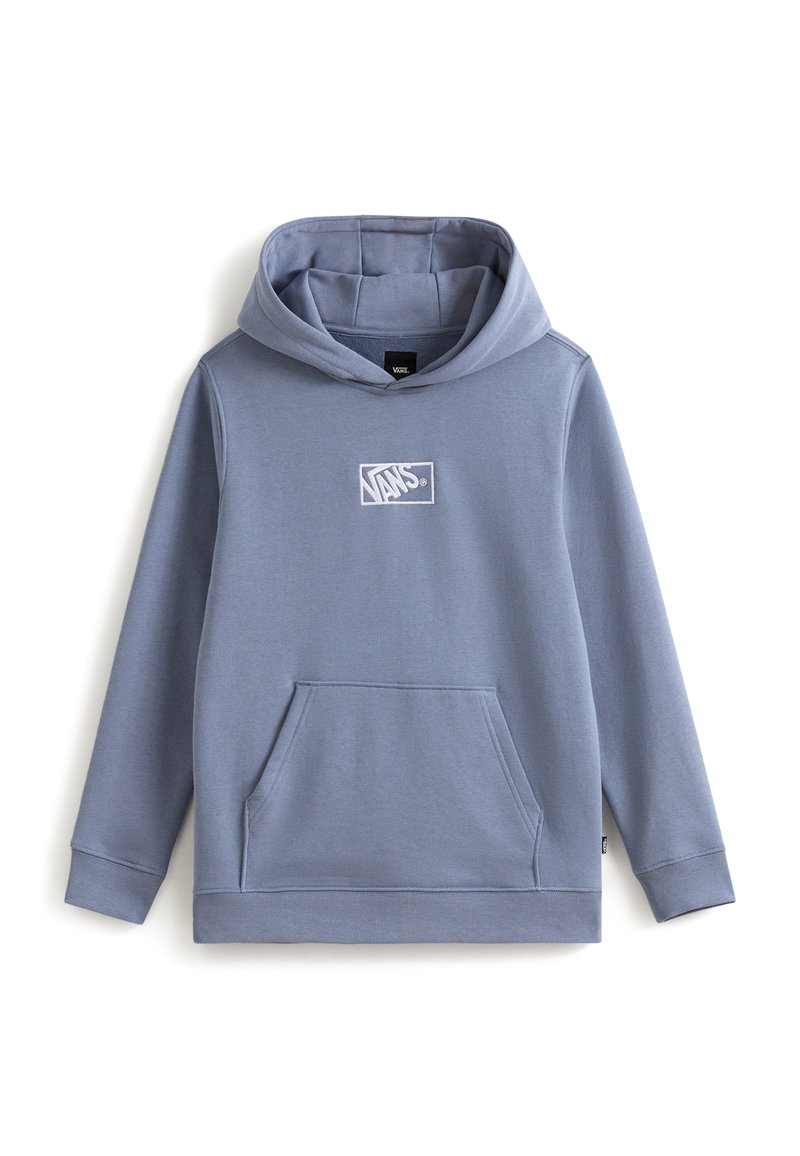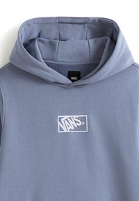 Felpa con cappuccio di colore azzurro chiaro, realizzata in tessuto morbido, con tasca frontale e logo Vans bianco sul petto.