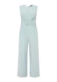 Jumpsuit verde senza maniche con dettaglio in vita annodato, scollatura a chiave e gambe ampie. Tessuto leggero e liscio con un aspetto drappeggiato.